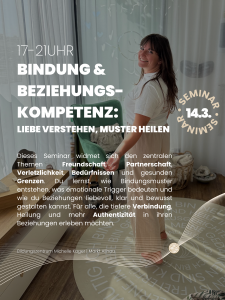 Dieses Seminar widmet sich den zentralen Themen Freundschaft, Partnerschaft, Verletzlichkeit, Bedürfnissen und gesunden Grenzen. Du lernst, wie Bindungsmuster entstehen, was emotionale Trigger bedeuten und wie du Beziehungen liebevoll, klar und bewusst gestalten kannst. Für alle, die tiefere Verbindung, Heilung und mehr Authentizität in ihren Beziehungen erleben möchten.