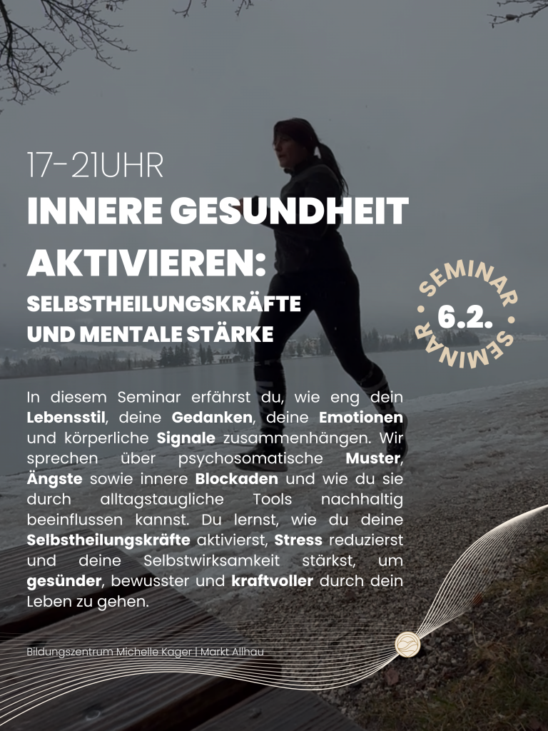 In diesem Seminar erfährst du, wie eng dein Lebensstil, deine Gedanken, deine Emotionen und körperliche Signale zusammenhängen. Wir sprechen über psychosomatische Muster, Ängste sowie innere Blockaden und wie du sie durch alltagstaugliche Tools nachhaltig beeinflussen kannst. Du lernst, wie du deine Selbstheilungskräfte aktivierst, Stress reduzierst und deine Selbstwirksamkeit stärkst, um gesünder, bewusster und kraftvoller durch dein Leben zu gehen.