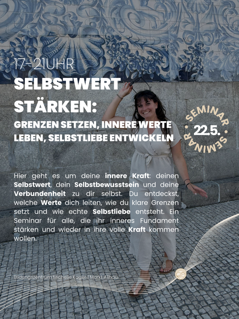 Hier geht es um deine innere Kraft: deinen Selbstwert, dein Selbstbewusstsein und deine Verbundenheit zu dir selbst. Du entdeckst, welche Werte dich leiten, wie du klare Grenzen setzt und wie echte Selbstliebe entsteht. Ein Seminar für alle, die ihr inneres Fundament stärken und wieder in ihre volle Kraft kommen wollen.